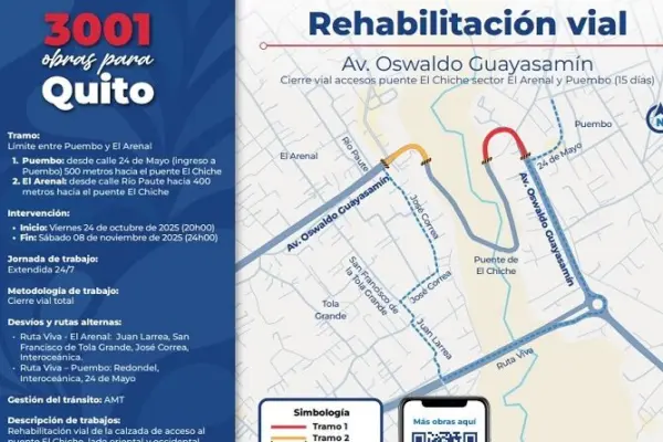 El puente El Chiche será cerrado por completo a partir del 24 de octubre a las 20h00 durante un periodo de 15 días. Este cierre es parte del proceso final de rehabilitación de la avenida Oswaldo Guayasamín, que busca mejorar la movilidad y seguridad en la zona. Durante este tiempo, el tránsito vehicular será desviado…