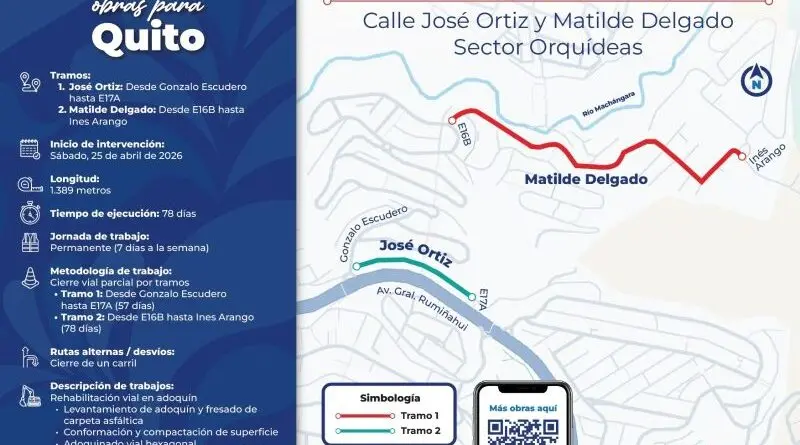 Los trabajos en la calle José Ortiz abarcarán desde Gonzalo Escudero hasta la E17A y tendrán un plazo estimado de 57 días. Simultáneamente, la calle Matilde Delgado será rehabilitada desde la E16B hasta Inés Arango, en un período de 78 días. En total, se renovarán 1.389 metros de calzada, lo que mejorará la circulación vehicular y el acceso tanto para los vecinos como para el transporte público.